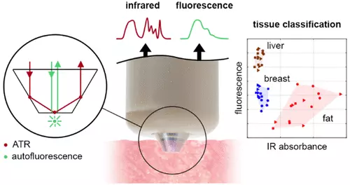 Technical evaluation of the probe has confirmed its output signal quality that was comparable to that of respective probes for single methods. The capability of the probe to deliver complementary chemical information from the same measurement point has been illustrated using model samples of biological tissue. Qualitative analysis of the biological tissue is one of the most important applications of the developed multispectral probe.