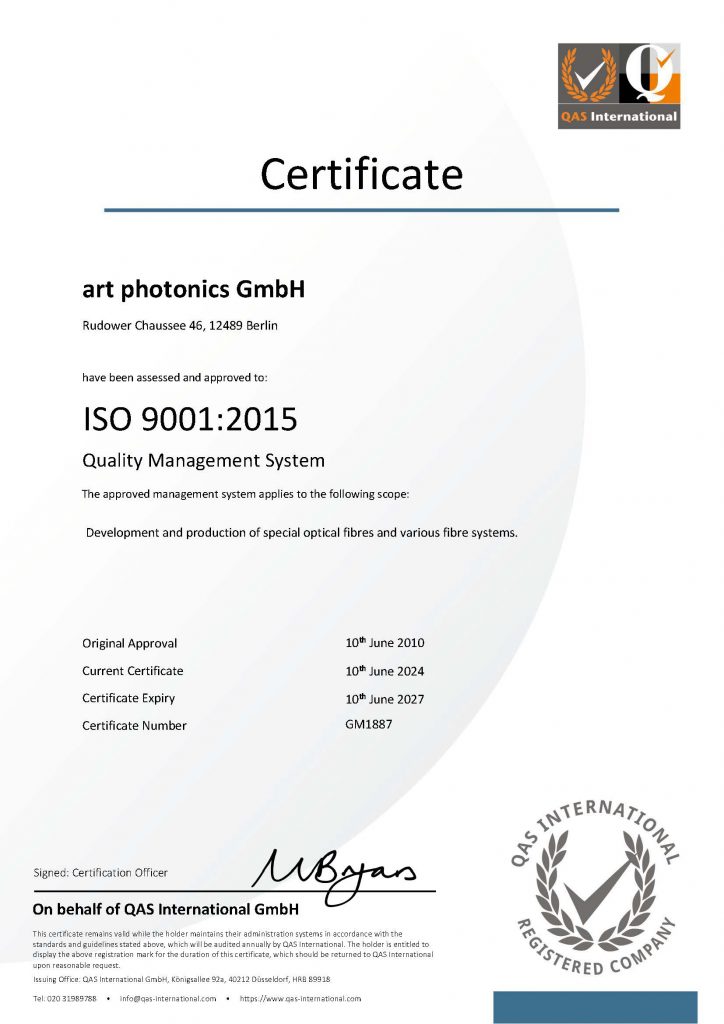 We are thrilled to announce that art photonics has successfully passed the ISO 9001:2015 Quality Management System certification. This certification covers our management system in the development and production of special optical fibres and various fibre systems.