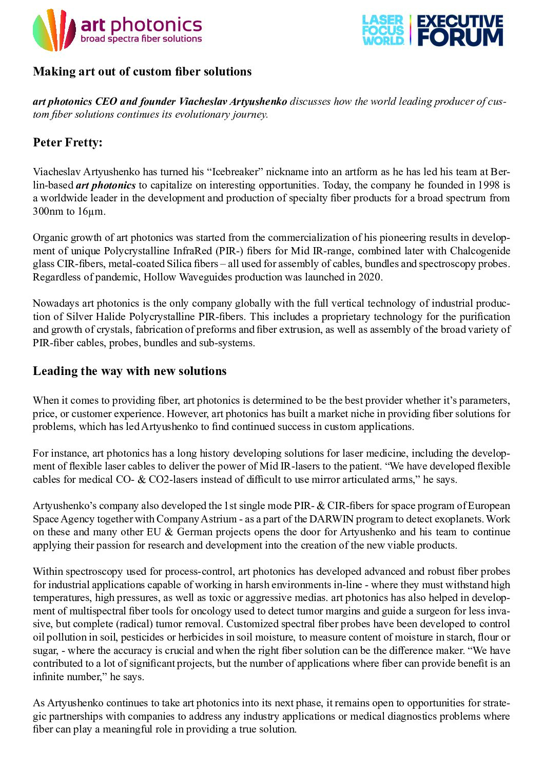 Are you curious about the revolutionary ways in which our custom fiber solutions are helping surgeons fight cancer and scientists discover new exoplanets? Our CEO, Viacheslav Artyushenko, shares insights into the limitless potential of our cutting-edge PIR- & CIR-fiber products in his latest interview.